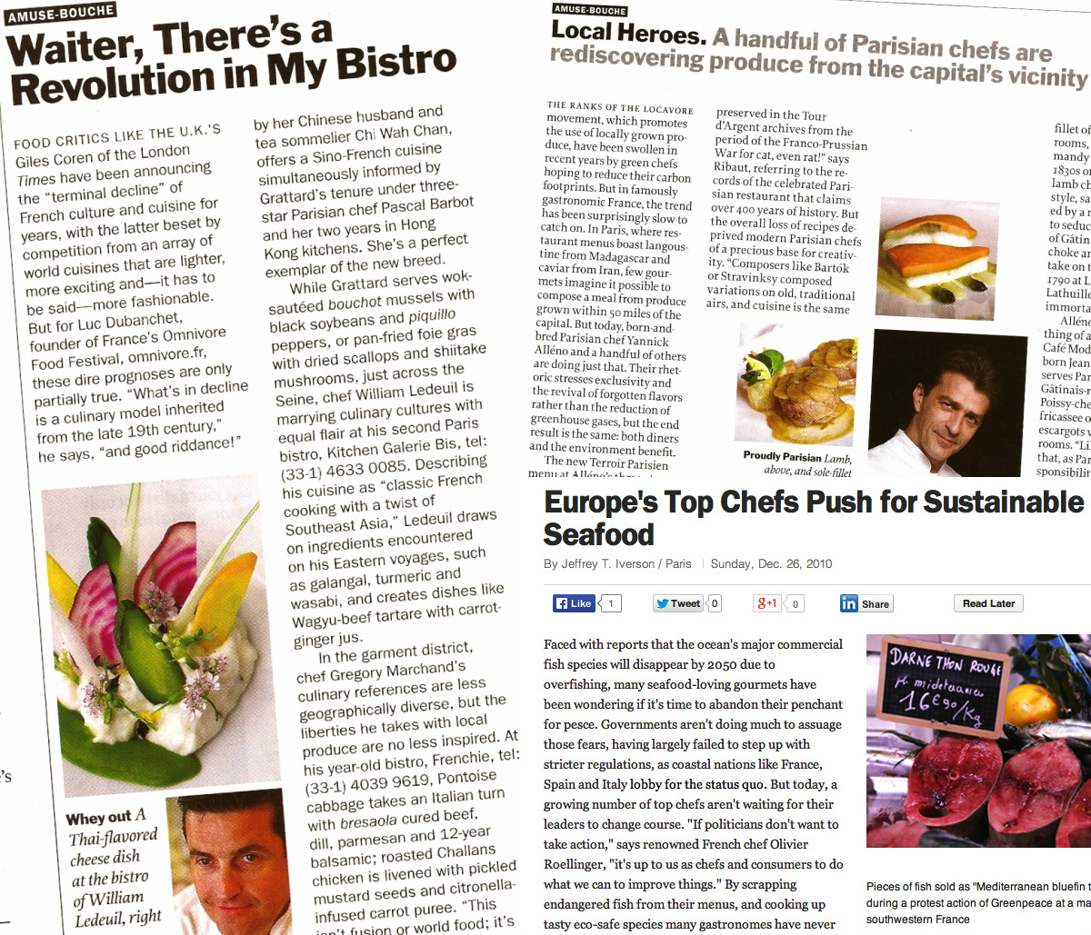 Soon I was covering stories such as the emergence of a locovore movement in Paris (precipitated by the dramatic loss of diversity in French produce and livestock species over the last century), a new push by French chefs for sustainable seafood in response to the crisis caused by irresponsible fishing practices, and a rejection of the old Escoffier school of fine dining by a new generation of globetrotting, multilingual French chefs who have begun reimagining their country’s cuisine in their image.